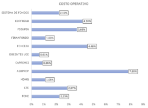 Para evaluar el costo operativo del ente previsional se ha realizado un análisis del gasto operativo con base en la relación con los activos productivos; CAPREMCI mantiene una relación de costo de USD 0,86 por cada USD 100 de activos productivos (inversiones privativas e inversiones no privativas). Sobre la base de este análisis, se evidencia que CAPREMCI bajo esta nueva administración es el segundo ente previsional más eficiente entre sus pares y mucho más eficiente que el promedio del total del sistema de Fondos Complementarios que mantuvo un indicador de 2,19%: